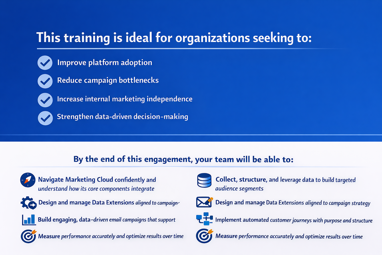 Salesforce Marketing Cloud® is a powerful enterprise platform — but without structured enablement, many organizations struggle with adoption, efficiency, and consistent execution.