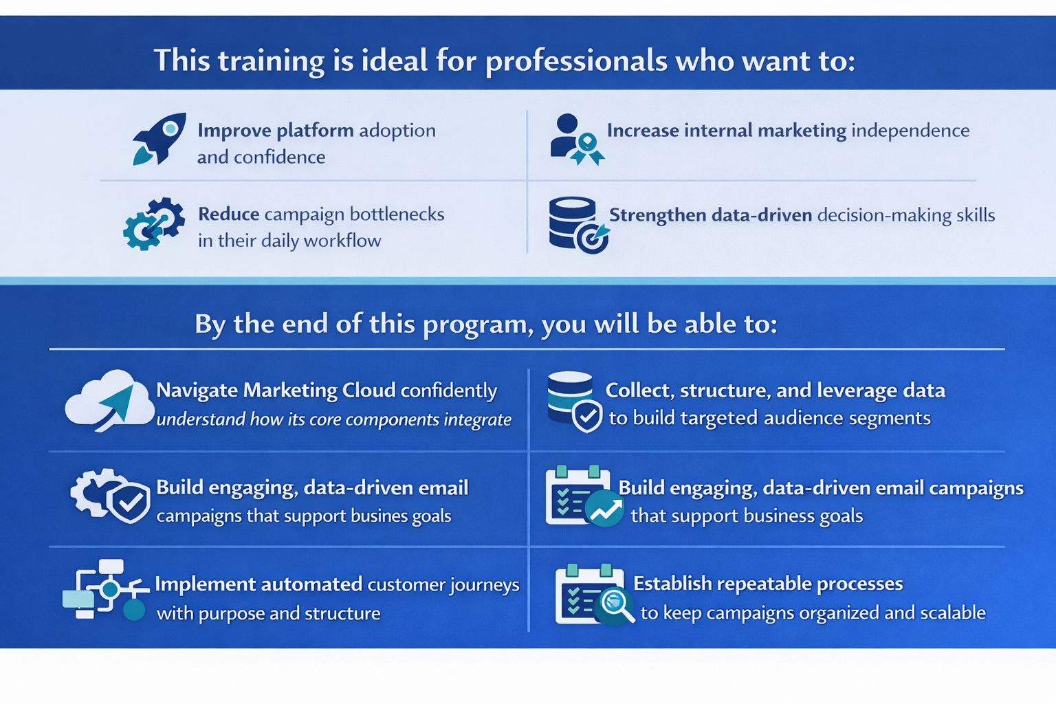 This training is ideal for professionals who want to improve platform adoption, reduce execution bottlenecks, and work more independently and confidently within Salesforce Marketing Cloud.