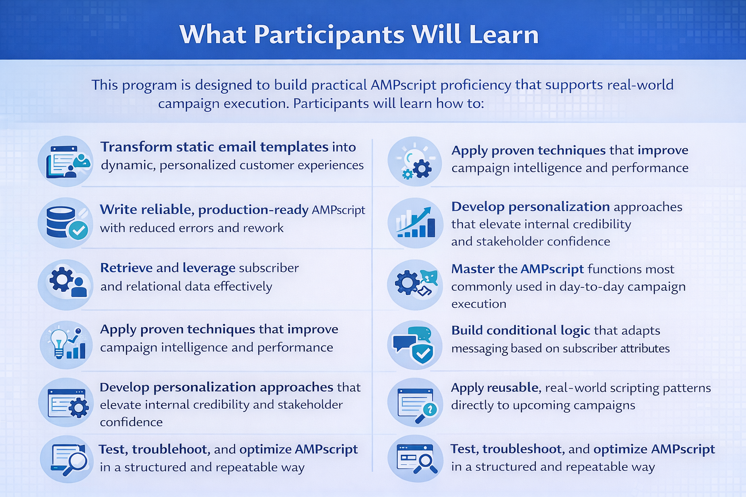 This 1-day instructor-led course is designed to help you develop practical, production-ready AMPscript skills. Rather than focusing on abstract theory, the training emphasizes real-world use cases that mirror how Marketing Cloud is actually used in day-to-day campaign execution.